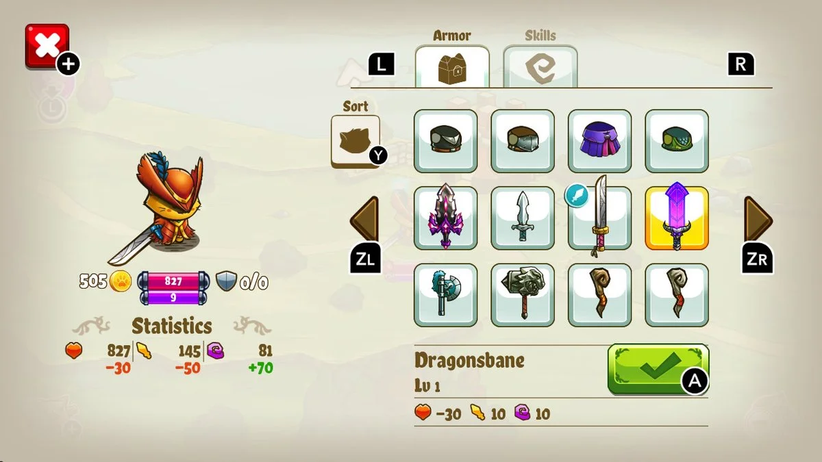 Combat and your very survival are affected by the stats of your weapons and armor. Several weapons can boost the amount of health or damage you do but may also decrease your magical ability, limiting the power of your skills. The same goes for armor as well, making the choice of what you wear something more important than just that fashionable look. The variety of the weapons and armor is rather impressive and you'll unlock dozens of different styles through chests or via the shops. One element that Cat Quest does incredibly well is duplicates are simply absorbed into the same item to increase its base stats, thus eliminating the need to sell items or flood your inventory with the same items over and over again. It's a smart move that puts the focus on playing the game more so than fumbling around with item organization.