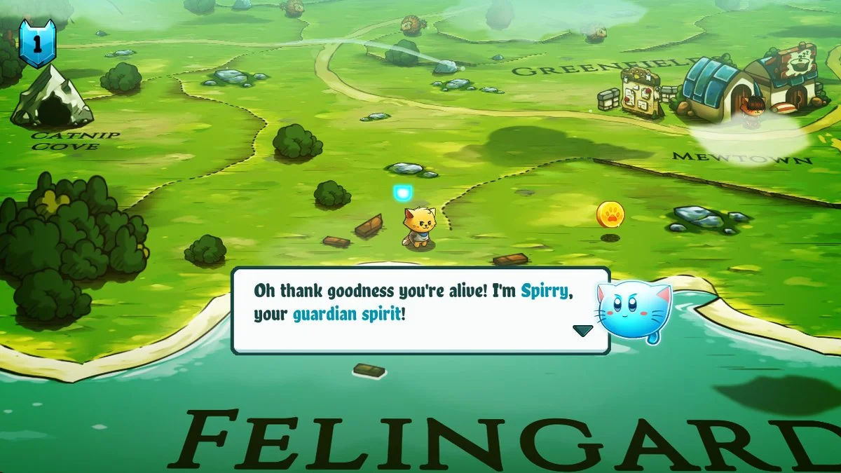 Much of the narrative comes from various conversations with side quest NPC's, the simple townsfolk, mystical stone landmarks, and from your sidekick Spirry, your guardian spirit. This loads the game up with numerous cat-related jokes, puns, and simple words like 'for' and very' being changed to 'fur' and 'furry'. This also translates to the towns and locations on the map having names like Mewtown, The Catpital, and Puss Plains.