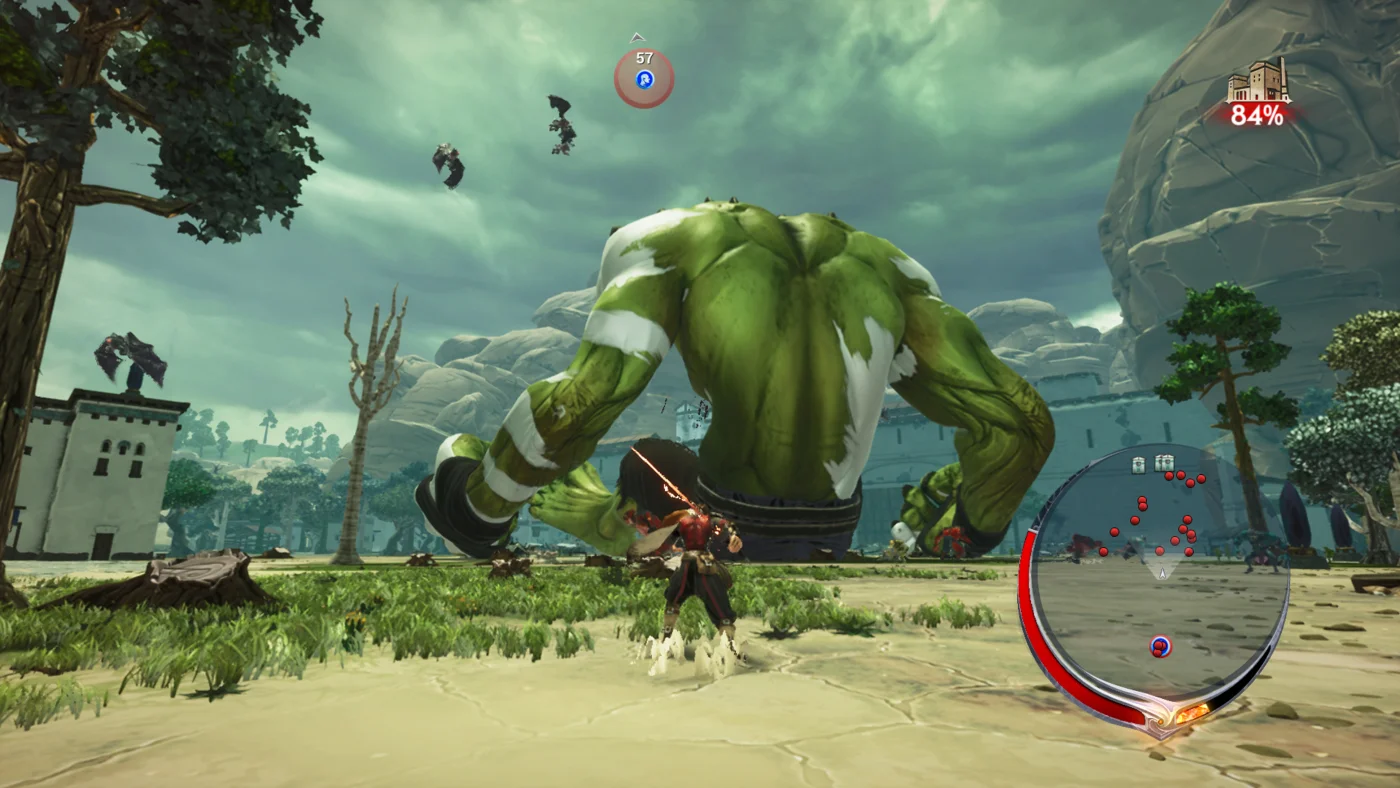 As you attempt to take down each of the towering Ogre's, you will have to watch out how much of the area it has destroyed. In the top right of the screen, you will have an extinction gauge, alerting you to how much is left for them to destroy before it's game over. I've completed missions with only 1% left, scrambling up the back of the Ravenii to chop its head off while it was in mid-swing, an effort that would have failed my mission. The Watchtower missions became the bane of my existence when I would chop the legs off a Ravenii to have him crash to the ground, with 15 seconds left to go on the timer. Now, those 15 seconds would prove to be pointless as, while on the ground, he would slam his fists just within reach of the watchtower and fail my mission. I've beheaded one such Ravenii that was about to drop the final tower when another would spawn on the other side of the map. I would get about halfway there and then suddenly another Ravenii would appear, but this time he would spawn directly in front of the previous watchtower, swinging his fists into it and instantly failing the match. The randomness is what kills this game; there is no handcrafted joy of a game here and it can lead to wildly inconsistent encounters.