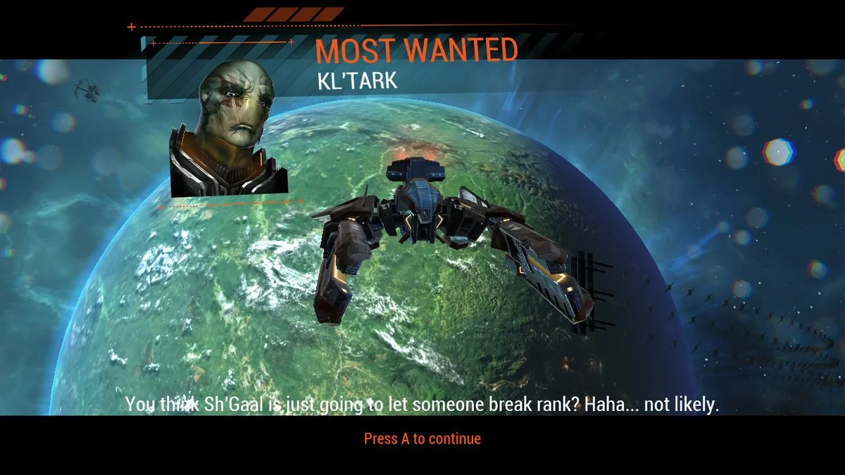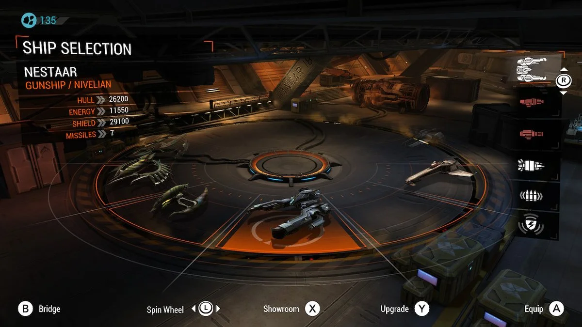 Each of the nine ships you can unlock are split into three categories; fighter, scout, and gunship. Apart from visual changes based on which faction they belong to, they vary in a few stats; Hull, Energy, Shield, and Missile capacity. Each of these stats can be upgraded to make the ship more reliable in combat. Each upgrade is unlocked depending on your level and the amount of Mhaan-Tiq you currently have earned. Your weaponry works the same way in that you can upgrade each of the different styles of guns you can equip to your ship. You can outfit your craft with primary and secondary weapons, a missile, as well as up to two different devices like cloaking your ship or causing an EMP pulse.
