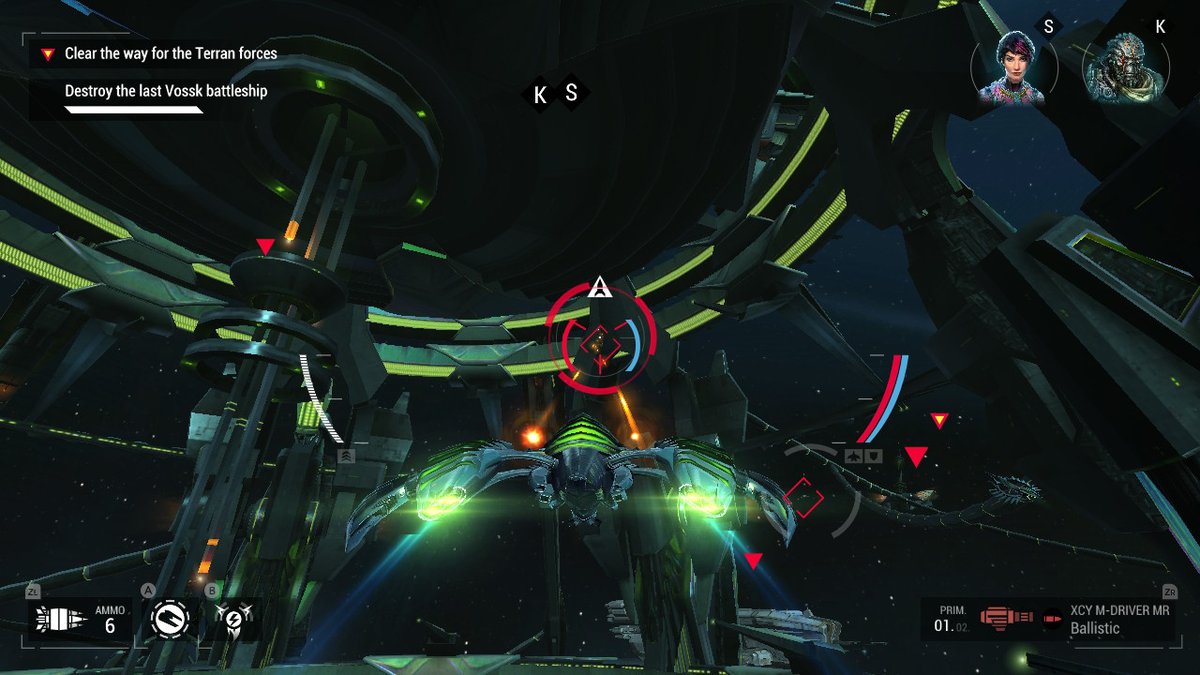 The story sees you as a mute pilot that is hired by Bryce Vantok, a grizzled old mercenary that follows several typical cliche character tropes. Bryce is investigating an event called the Shattering, a cataclysmic event that resulted in the loss of several members of this crew as well as hundreds of civilians. Bryce is in charge of the Manticore, a ship that serves as the base of operations for the team, which is also called the Manticores. You'll visit this ship to take on new missions and upgrade your ship and variety of weapons.