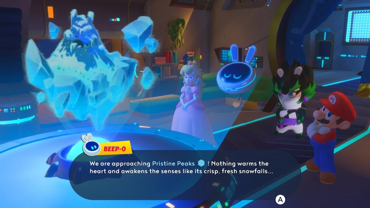 Sparks of Hope is a direct sequel to Kingdom Battle, where the Rabbids from the previous adventure have found a home alongside the Mario cast. Everything is seemingly peaceful until a large looming presence overhead engulfs the castle in black gunk, kickstarting the core cast of characters to take to battle, guns at the ready, and surprisingly equipped with an interstellar spaceship and a new AI to aid in their journey.