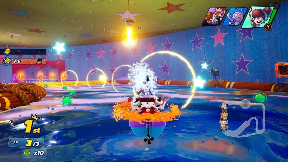 One of Kart Racers 3’s only unique offerings is its chief and crew mechanic. This is one element where the game does have its own idea, or at least, one that doesn’t have me immediately thinking of yet another kart franchise. As you collect slime coins or drive through areas covered in slime, you’ll charge up your slime gauge, which powers your chief skill. Chief’s are a selection of special characters such as Mr. Krabs, Asami, Gaz, Tenzin, and a few more. Chief’s have skills that aid you in racing, from hitting players with a pancake spatula to obscuring the vision of your opponents with a simple smoke bomb. While I would prefer that the drivers themselves had these unique abilities, to allow them to feel different from one another, this is a fairly alright compromise, but certainly a mechanic I would love to see further fleshed out in a potential sequel.