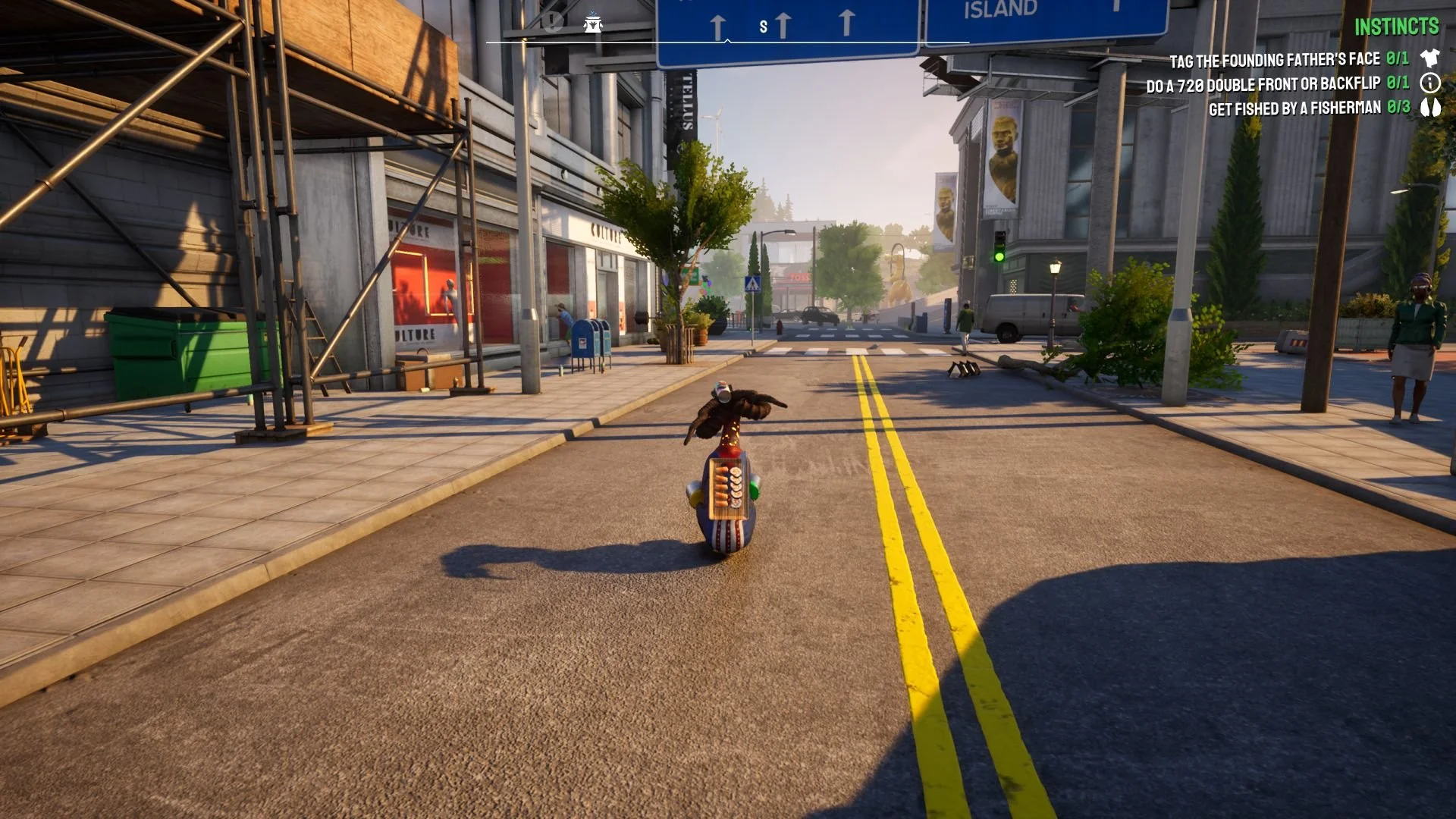 While you’ll have a ton of quests to tackle, you’ll also have what are called Instincts. These bite-sized challenges are rather simple to complete and as you progress, you’ll constantly have more to work towards. These range from performing a simple backflip, attaching rockets to three people in a row, to using a clothing launcher on the police. And, as you collect more and more clothing items and variable weapons, you’ll unlock more Instincts that relate to those particular items.