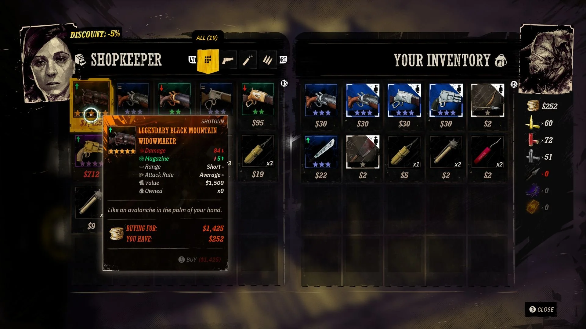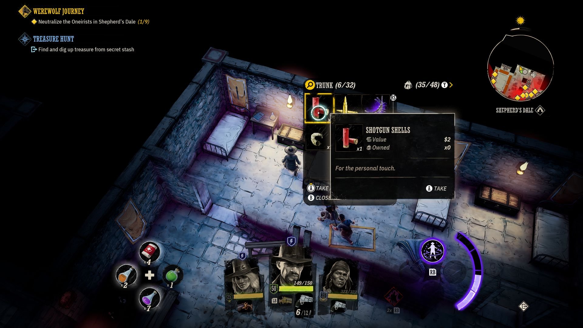 Weird West offers you a few weapons to deal out justice in the form of pistols, shotguns, rifles, bows, and throwables. You’ll find stronger weaponry as they are notched with a star rating system, but apart from hitting a tiny bit harder, there isn’t much difference from one pistol to the next. You can outfit your companions with better weapons, and buy a horse to store items as well, keeping your inventory from being full all of the time. You’ll find fairly decent weapons out in the wild, but most of the time you’ll retreat to local shops that have those higher-tier weapons that might squeak out slightly better damage. You can upgrade your weapons as well, and oddly enough, sometimes those are better than the higher-tier guns you’ll buy. As you collect more weapons, you can either sell them for cash or break them down and take a few bullets from each dismantled piece. You can ransack bodies for more bullets, and you’ll certainly need them. I still find it disappointing that revisited areas for new bounties don’t refill their chests or searchable objects, so you’ll have to solely rely on pilfering the dead to refill your stocks, often recouping your costs for the mission from the bounty itself.