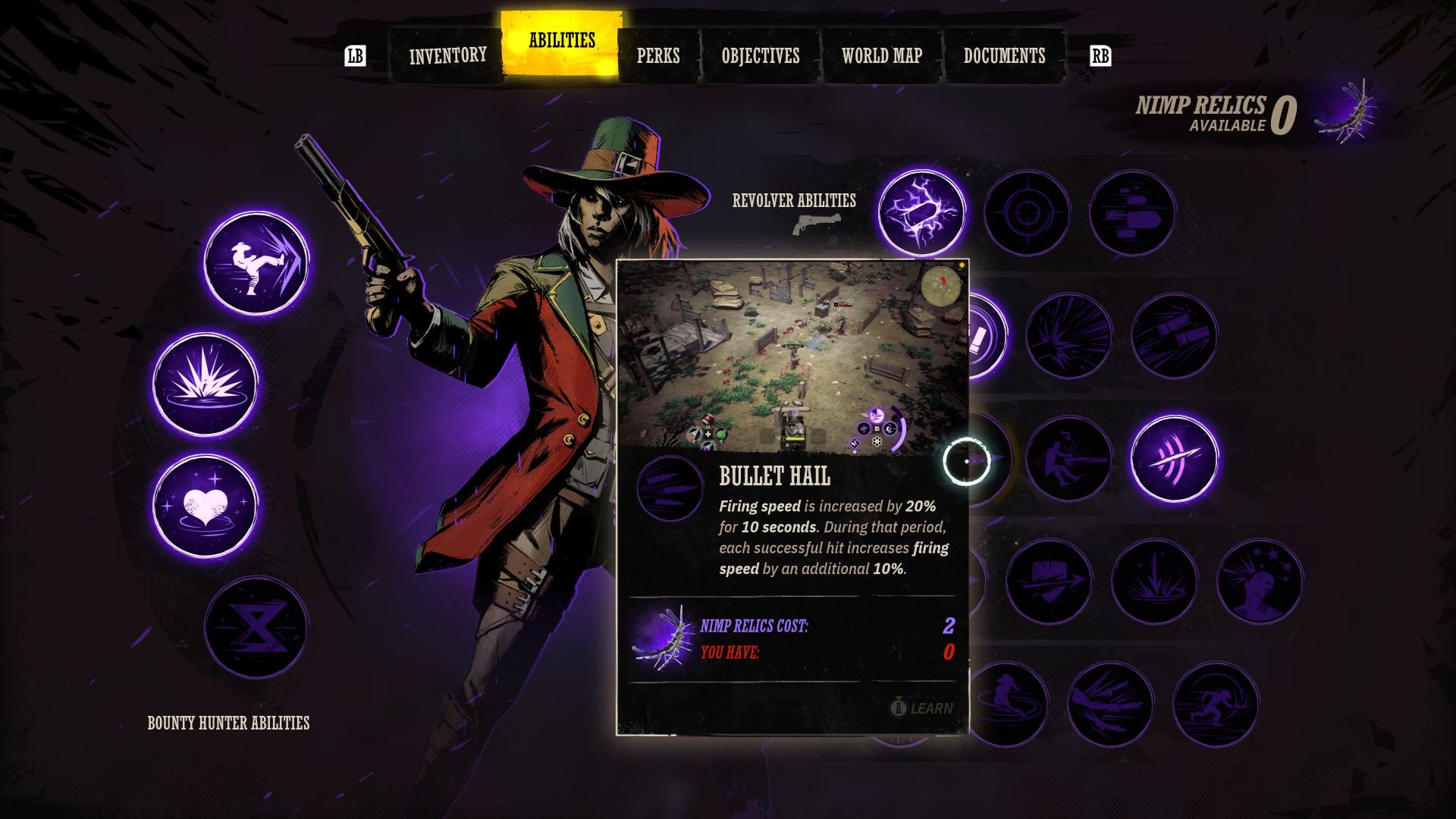 Each character has four core abilities as well as three to four per weapon, offering up various ways to make your weapons a bit more punchy. Personal abilities range from the pigman’s barreling charge, becoming bulletproof, to the bounty hunter Jane being able to land a roundhouse kick or lay down shrapnel mines. Later abilities for your remaining characters range from summoning a bear to maul nearby enemies, teleporting to avoid stray bullets or used to evade incoming fire, to shapeshifting into a werewolf. As you collect Nimp Relics, which are pretty common to track down or even purchase at some locations, you can put these towards weapon or class abilities, letting you figure out just what you want from your character, or how they will use those abilities as companions later on, even if they often use those skills at times where there isn’t a need for them.