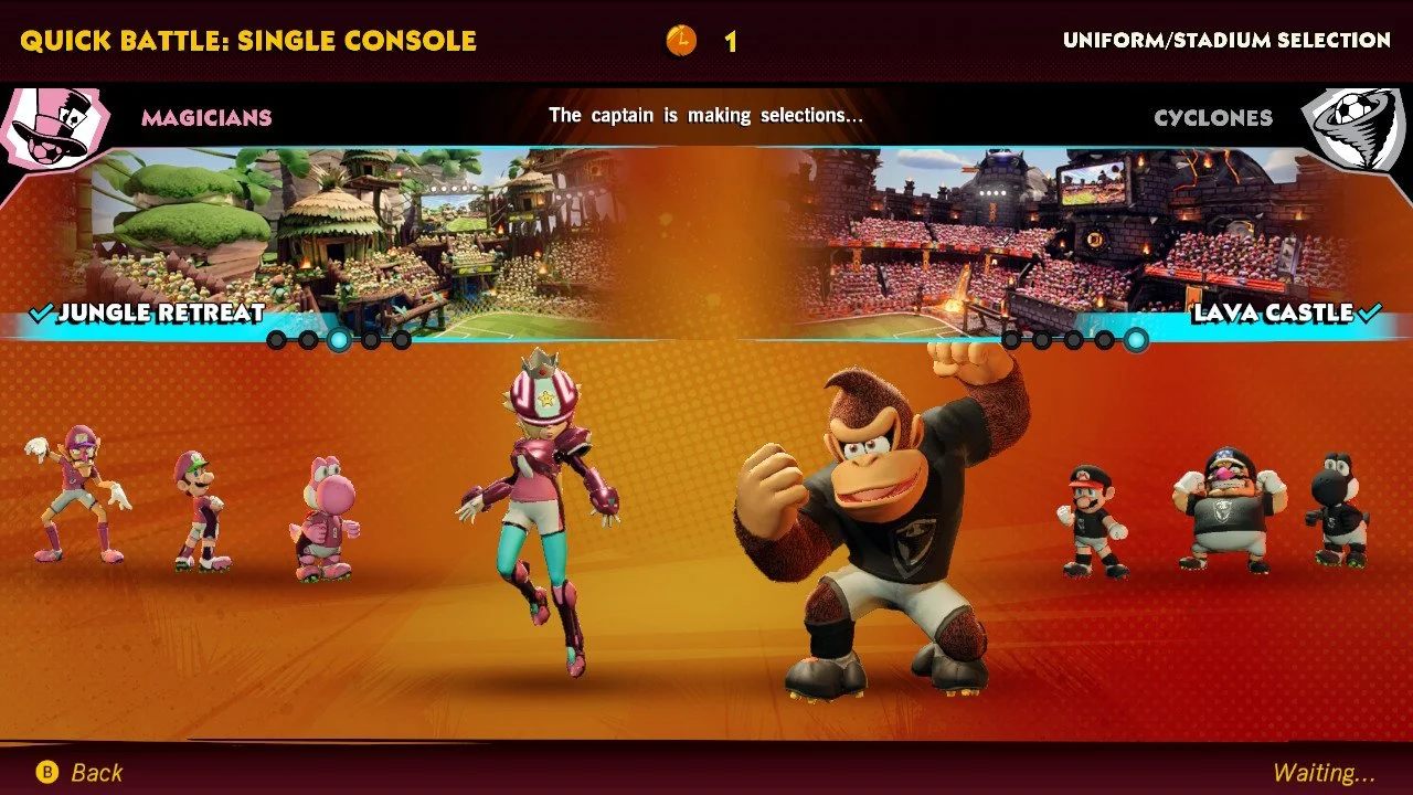 Currently, you can build a team from 10 available characters; Mario, Luigi, Bowser, Peach, Rosalina, Toad, Yoshi, Donkey Kong, Wario, and Waluigi. While matches are built around 5v5, your goaltender will always be Boom Boom, as Kritter and Robo-Kritter are nowhere to be found. It’s a shame that there isn’t more variety here in that regard, or even having core Mario characters take to goal and have varying stats to make matches more interesting.