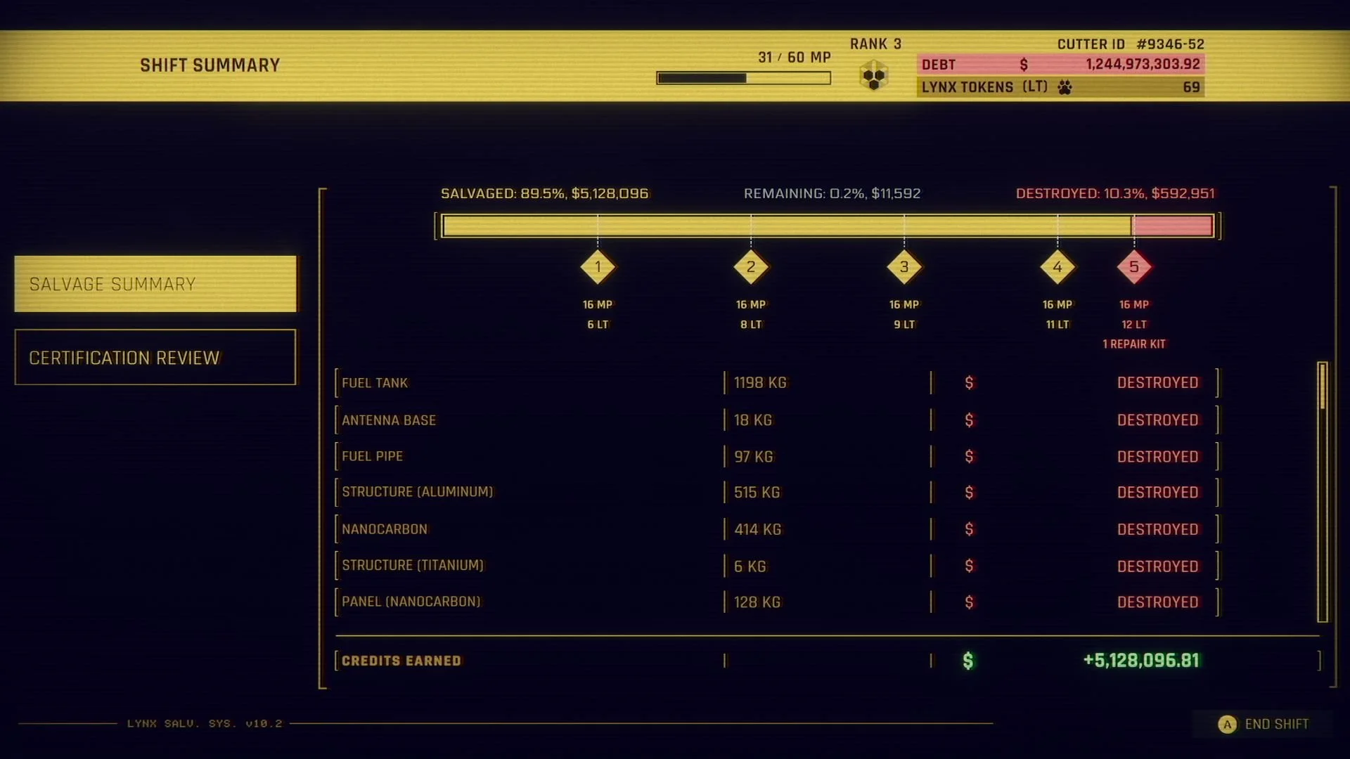 To keep you focused on depositing the correct materials in the appropriate bins, you have a bar at the top that details your overall success rate. By efficiently harvesting your salvage, you’ll earn upgrade tokens to improve your equipment as well as earn experience to rank up, offering you access to bigger and more profitable ventures. LYNX Tokens can be spent to upgrade your laser, grapple, thrusters, scanner, helmet, work suit, and demo charges. There are tech trees that boost various passive skills like improving your thruster capacity, or not having your tools wear out so frequently. If you save up enough LYNX Tokens and hit the appropriate rank, you can own your tools and negate the rental fees. You also need to repair your tools after a while, which can be a costly affair. Thankfully, the various ships you find can often have repair kits and other useful items to grab, even if you are told it is against regulations to snag them.