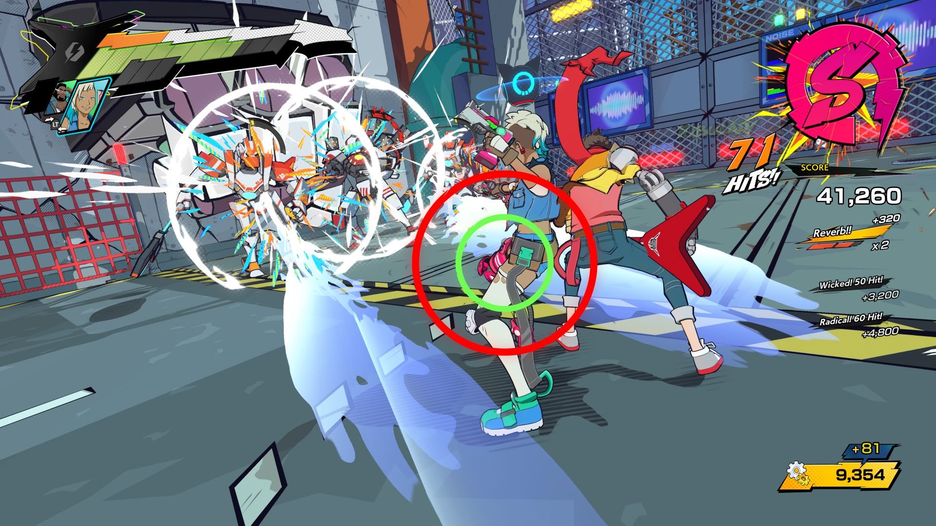 Aiding Chai in battle are his friends, summoned onto the field via a special teleporting trick through 808. You can press RT to bring them into battle and LT cycles through each of the three allies you have at your side. The overall combat is likened to that of Devil May Cry with over-the-top ground and ariel combat that have you earning a score as your dish out combo after combo. Having an S-grade combat encounter flowing during combat has a crowd chanting “Chai! Chai! Chai!” that really fuels you to continue to lay the smackdown. Every action you do in combat is rewarded with powerful-looking animations and effects to the audio scores of those fans chanting your name, it’s infectious.