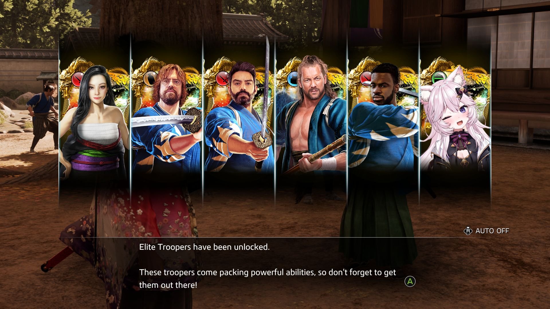 Another outlet to take advantage of is the new Trooper Card system. New to Like a Dragon: Ishin! are a series of combat cards that you can equip to each of your fighting styles. Once charged, these cards unleash powerful attacks or buffs and grant Ryoma additional health and combat options. The cards largely utilize characters you’ve fought throughout the game or those already under your command, but Legendary Trooper Cards can also be acquired that feature the likes of Midnight Mass’s Rahul Kholi, Cosplayer Vampy Bitme, AEW’s Kenny Omega, and VShojo Vtuber Nyatasha Nyanners, among more. While not historically accurate, there is something pretty satisfying about seeing Nyanner’s little sidekick Goro zapping the health out of your foes and saving Japan in the process.