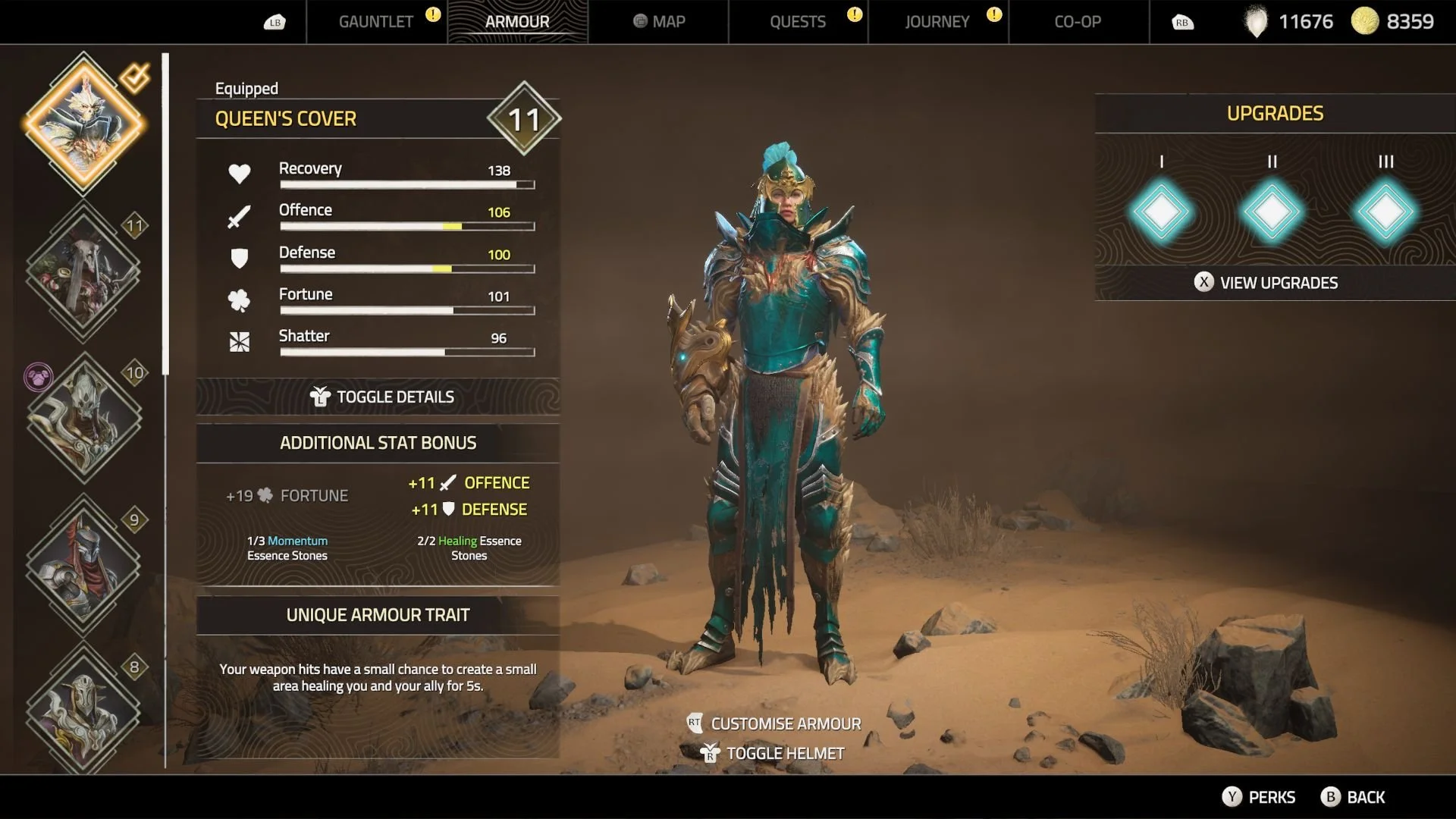 Each armor set can be upgraded a few times, boosting its overall stats. Each set also has bonuses that vary on what types of Essence stones you have equipped, which I'll be getting into those shortly. These grant stat bonuses like additional defense or increasing your overall damage. Each upgrade across all armor sets also grants you a perk point. Atlas Fallen features 12 perks that can each be leveled up, from earning more gold from enemies to providing a boost to your sand surfing, should you snag a plant while gliding that is. Perks are pretty useful to get the most out of various systems, making the need to level up each armor set something that is actually worth doing, even if that armor set doesn’t match your overall playstyle.