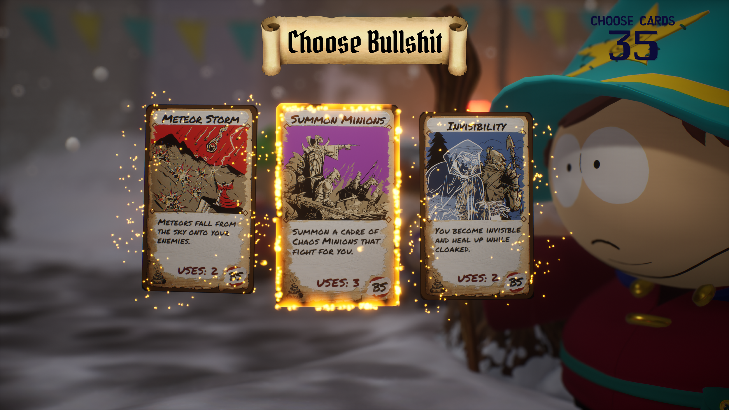 Where the game gets even remotely interesting is in its card system. As you begin each level, both you and the antagonist of the level, whether it be Stan, Cartman, or three other individuals, each side will pick one upgrade card to set the tone. These include upgrades to your weapons and powers, such as affecting your dagger dive, double-tapping with your bow, to your daggers dealing 25% more damage against bleeding enemies. Then, you’ll pick your bullshit card, a limited-use special card that can turn the tide of battle. From turning into a giant to having laser eyes, to summoning a group of chaos minions to fight for you, there is a modest variety here to choose from.
