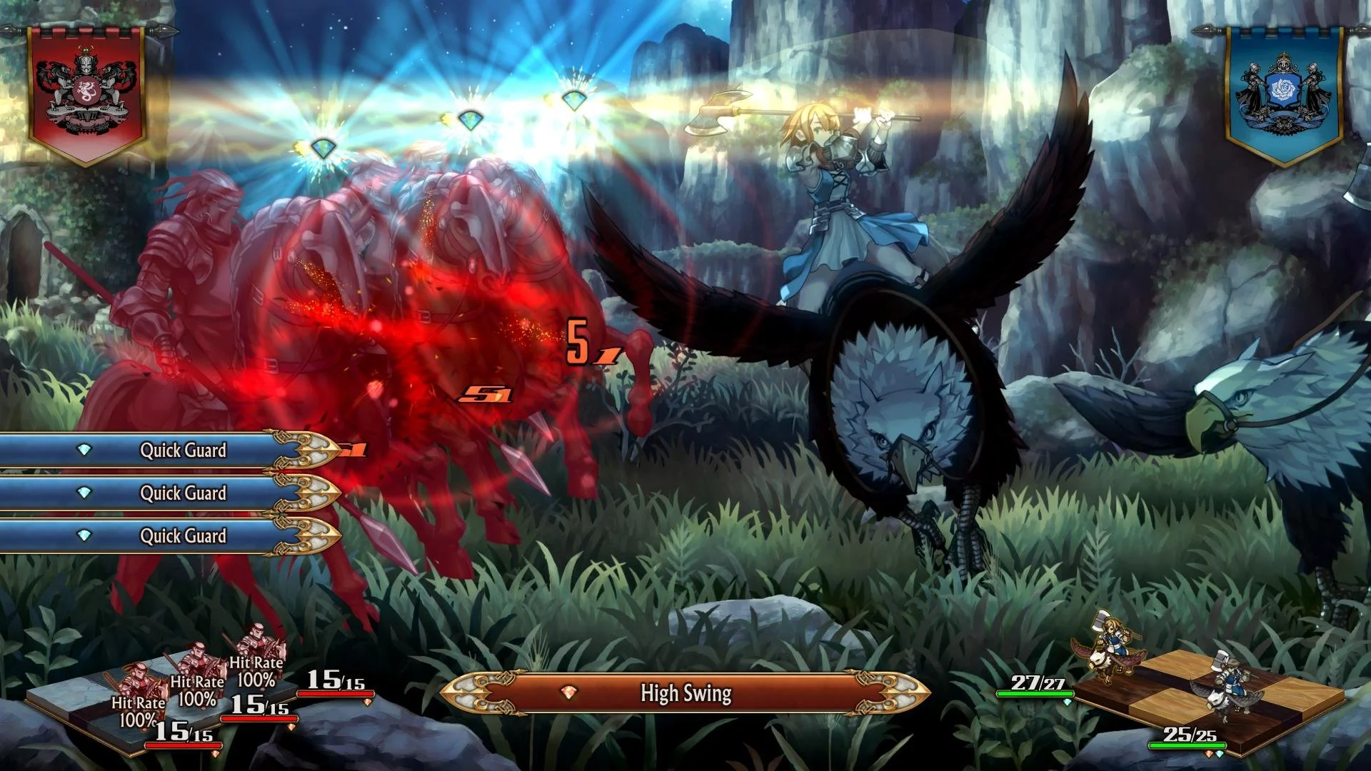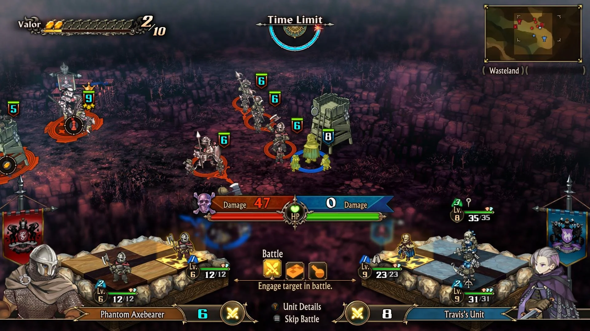 Once deployed, you'll then start to position units against targets by selecting the target or a spot behind them, allowing them to attack anything that gets in their way. Like Fire Emblem, it will showcase how much damage you may do and how much you'll receive as you approach each threat. Valor can also be used to pull off a variety of unit specific skills, such as axe swings or a barrage of arrows. These vary based on your unit's formation and its cast. By directing your units around, they will then attack whatever they come into contact with, or can be directed to use catapults or other offensive weaponry strewn about the battlefield.
