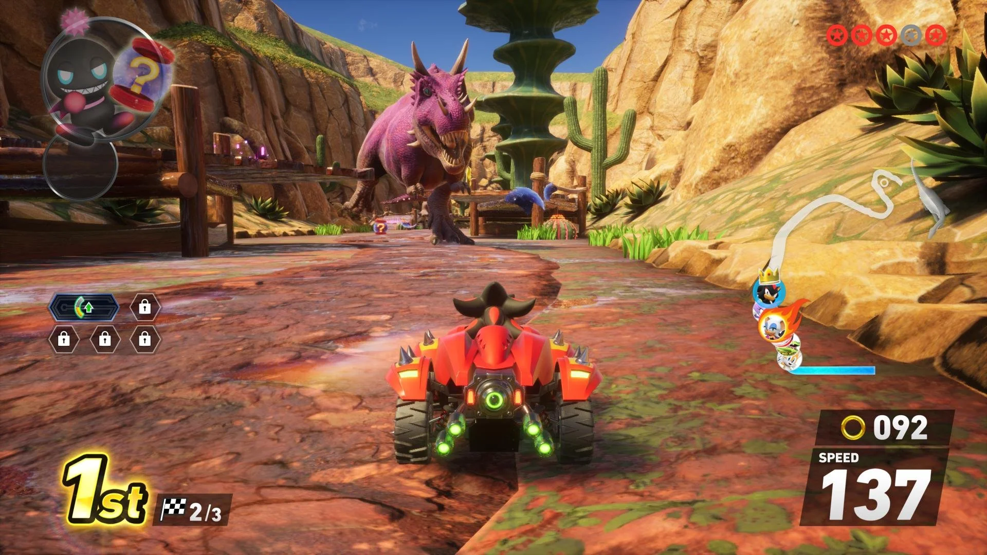Portals take you to a variety of worlds, inspired by several environments from Sonic’s past. From Roulette Road, Sky Road, Dino Jungle, and Kraken Bay, there are a total of 15 of these Crossworld portal courses that can be swapped to during the game’s 24 main courses. Given how these are just one lap, I’m shocked there are not considerably more. However, during my race to complete all the cups, I only ran into 12 of these courses in total; some I had seen nearly a dozen times. Courses have a series of shortcuts and different paths to take, but the diversion to another level does cheapen these a bit.