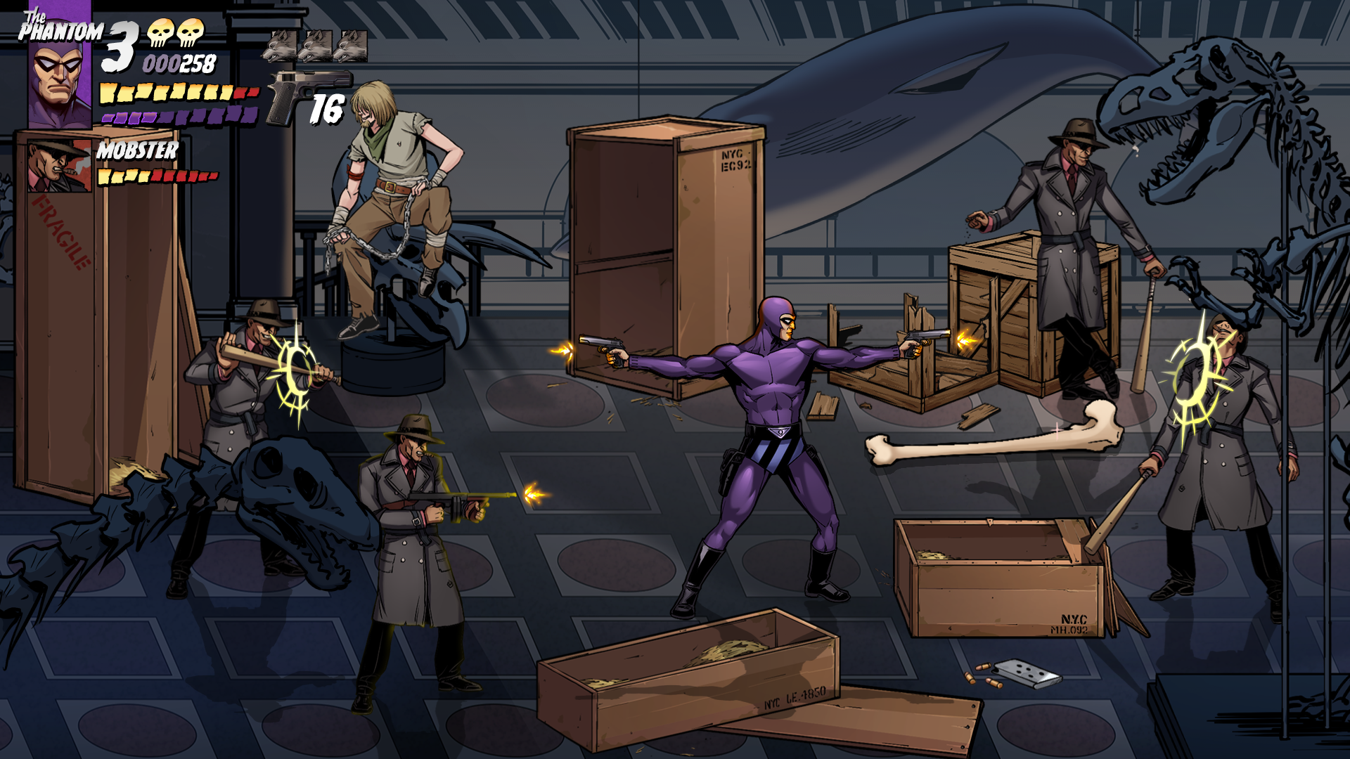 Where The Phantom suffers the most is that everything feels stiff and with unresponsive controls, I felt my attacks, movement, and abilities only worked half the time. I would solve most encounters by simply drop-kicking left and right, or a punch, punch, kick, punch, punch, kick, combo that seemed to work. However; without a dodge, block, or ducking system, you are left vulnerable to ranged attacks with little recourse on how to deal with them, especially if you are in the middle of a combo you can’t break out of, or that pesky throw animation that will come out of nowhere. It’s frustrating to be hit with these attacks after a level that feels way too padded and lengthy to die right at the end on a ranged attack that comes from off-screen.