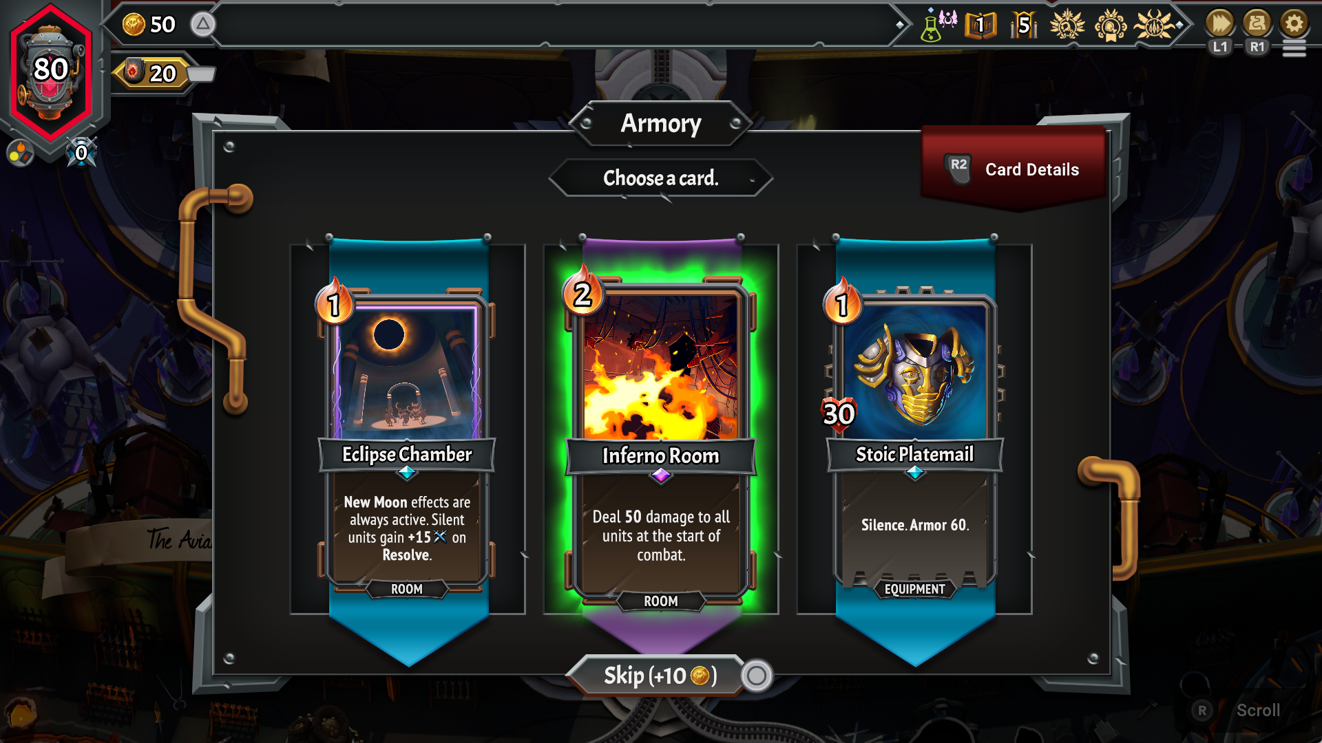 Cards vary in their purpose. Some deal direct damage buffs to your team, apply weakness to your foe, or are simply units you place on the field. Each unit has an Ember cost as well as a room cost, which dictates how many units can occupy each level of the train car. There are also room cards that can grant certain things if conditions are met, like bonus gold if either friend or foe perishes in battle.