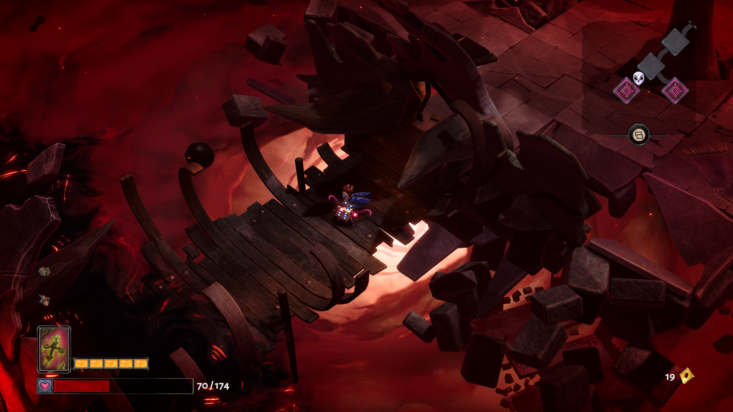 The upgrades to Aleksandra help immensely. Her personal upgrades vary from increasing your max health, the range as to which you pick Fortune back up during combat, to being able to ignore the first hit of damage in any encounter. For as mighty as you can make her, however, the choice of weaponry will factor a great deal in how you engage in combat. You'll choose from four weapons: the Sword of Sixtopia, the Sevendipity Striker, the Lance of Lady Luck, and finally, the powerful Helleven’s Hammer. While you'll start with the Sword, I opted for the bow and rarely looked back. Sure, the Lance and Hammer are very effective, but bosses like Eema, another of the wonderful witch sisters, felt far more manageable with the bow, keeping me at a distance while being able to hit her, despite the bow’s awkward distance limit. Each weapon has a series of enhancements, all of which affect various attack methods. Thankfully, you can upgrade and swap these out any time you return to Rack, the old rusty mechanized pawn.