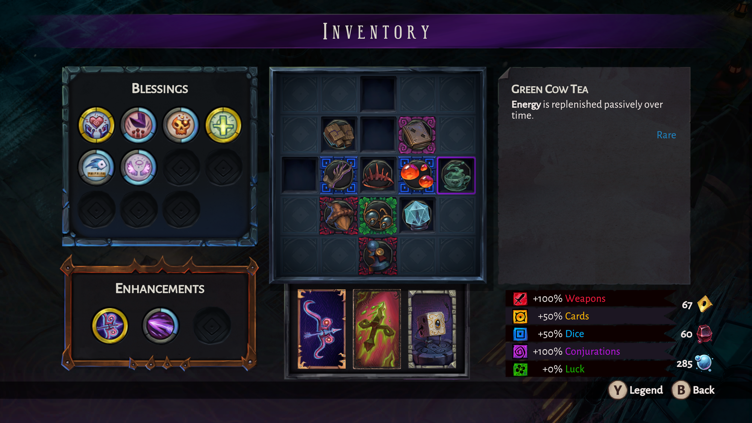 Combat is incredibly fast and fluid and is considerably better than the original game, though, to be fair, each game is vastly different. You can dash, throw Fortune for some assistance in dealing damage, and use each of the four weapons to dish out your own pain. Aleksandra will also benefit from cards that grant an additional attack, as mentioned before. You’ll also use Relics and Pearls as well to craft unique builds through each run. Pearls are mainly used for color matching and break when harnessed. Relics grant unique passive powers and do not break when harnessed for boosts.