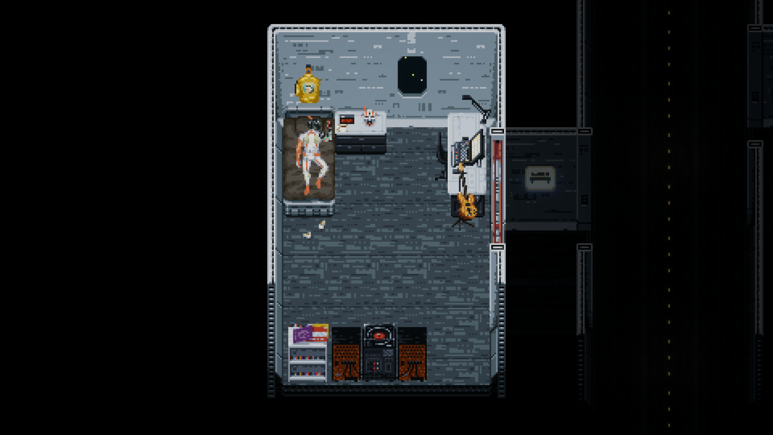 The Last Night ship itself is a pretty interesting place, mainly due to its 2D nature. This is an isometric/top-down 2D version of the ship, with rooms that feature the cast. That said, you'll really only interact with the aforementioned characters in their rooms when you truly need to or as part of the story. That, or for giggles, but I rarely found the desire to.