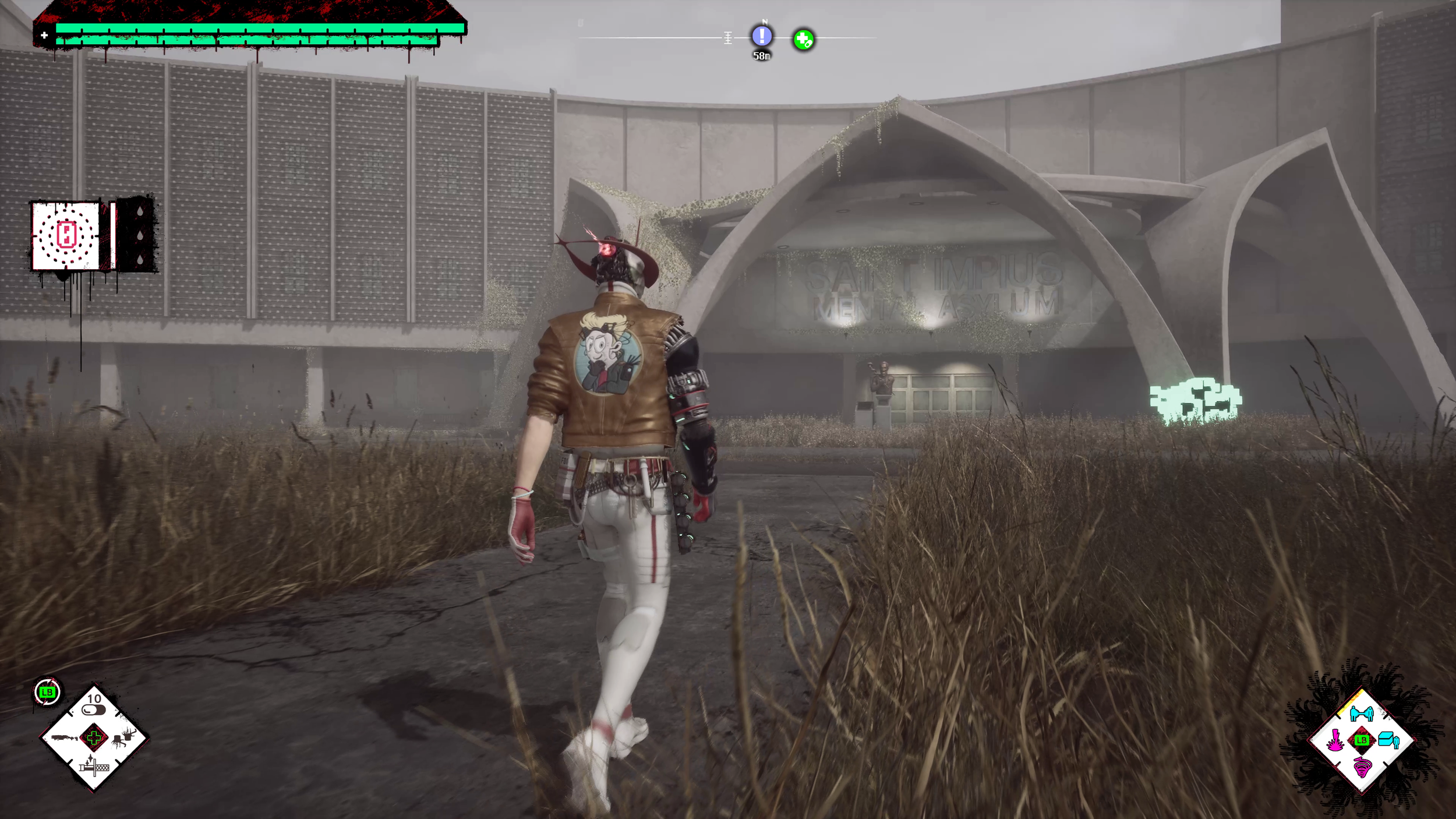 If you’ve played No More Heroes, then you are going to find combat very familiar. While combat is gory, with a lot of digital noise to represent the blood and digital effects that come with the style of this game. It does feel more janky than I’d have liked, especially given the time it has been since No More Heroes. You do have a dodge, but no animation cancels to use it effectively, and while the gun is extremely well-suited for hitting the weak points on your foes, illustrated via little flowers that adorn their body, the reload time and feel of the guns with manual aim leaves a lot to be desired, especially with the bats. However, using the target lock for the more frantic enemies and those aforementioned bats is the go-to move here, especially when you are high atop ledges and do not want to fall, again… and again.