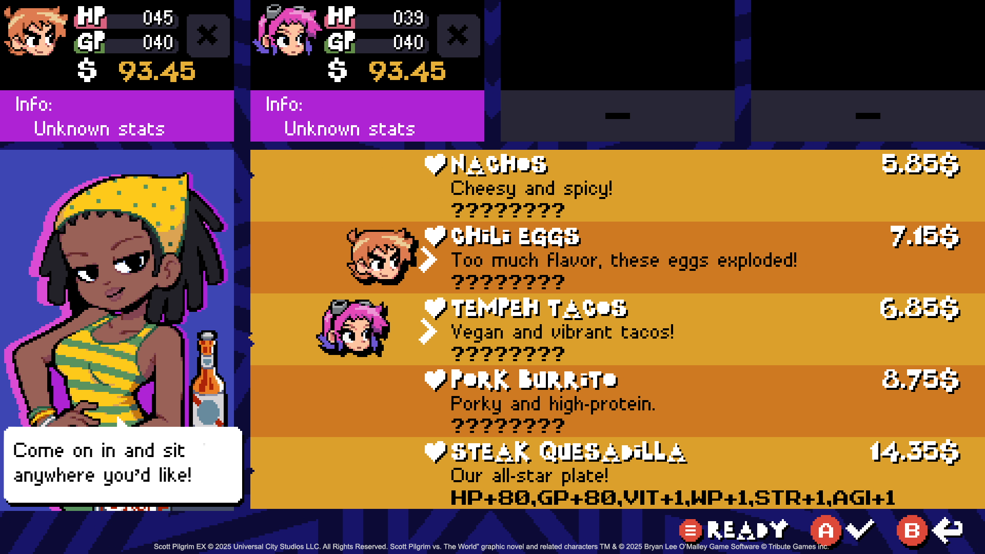 Playable from the start is Scott Pilgrim, Ramona Flowers, Lucas Lee, Roxie Richter, Matthew Patel, and Robot-01, with a bonus character unlocked once you complete the game. As the members of Sex Bob-Omb are kidnapped, you sadly don't get to slice and dice as Knives Chau this time around. Still, the cast is wildly diverse, with Lucas Lee performing skateboard attacks, summoning demons with Matthew Patel, and Roxie Richter taking on the role of the slice and dicer.