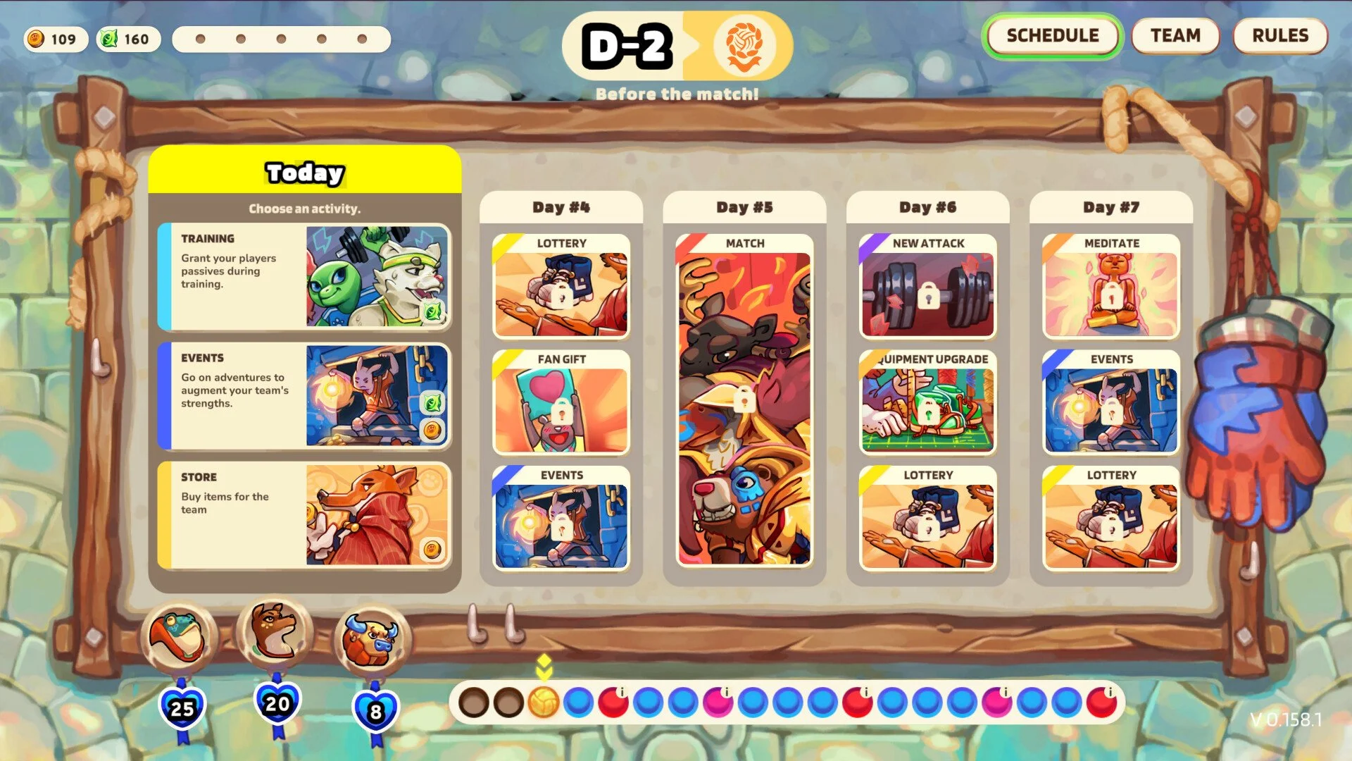 As you progress through the calendar, different options will show up. Often, and this is highly recommended, do everything to boost your gold earning and sparks of inspiration, as you’ll use those currencies to have a chance to upgrade your team, boosting their resistance, mobility, and strength. This is crucial in the more difficult cups as it is easy to be outmatched very early if you are not prepared.
