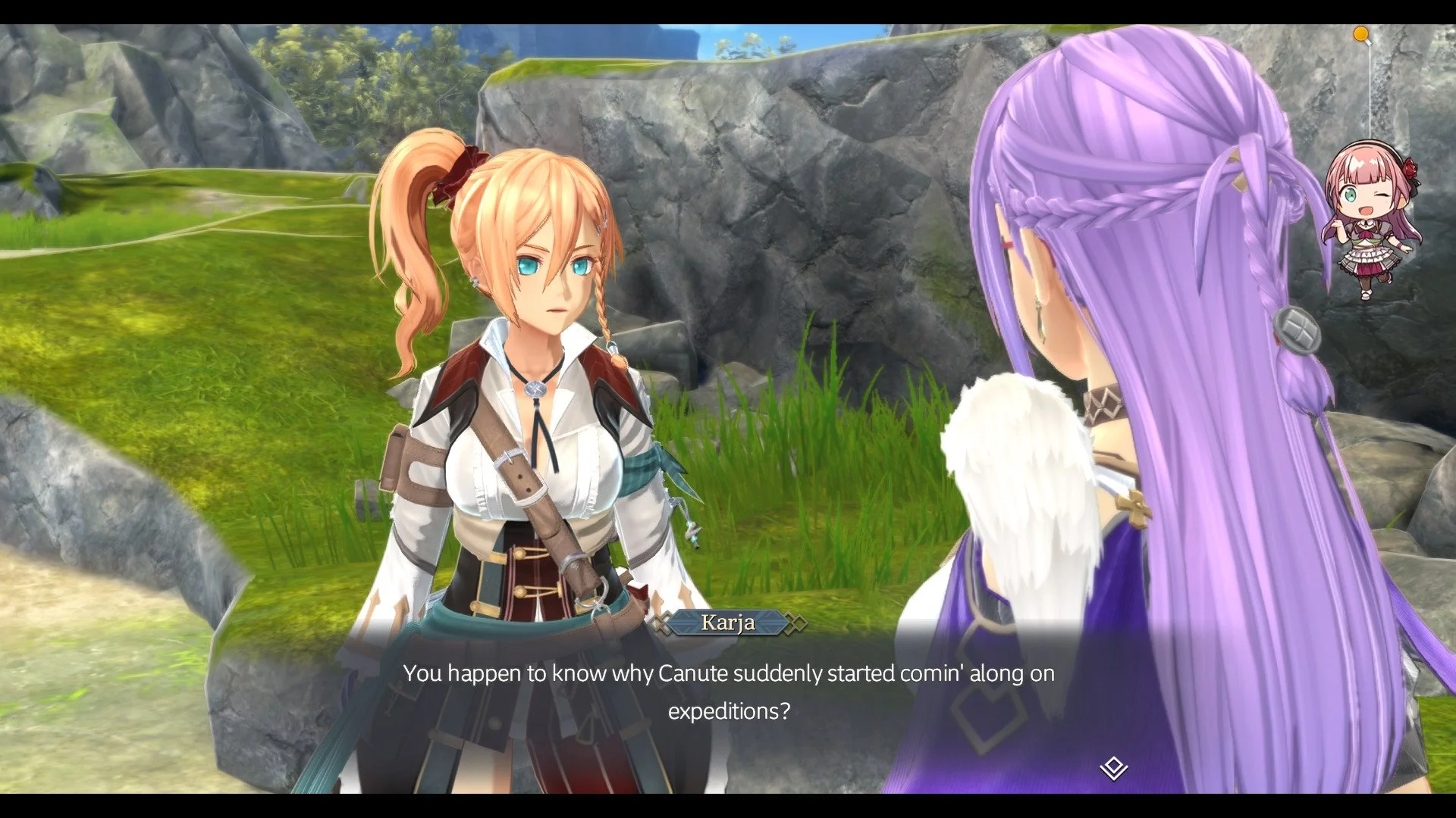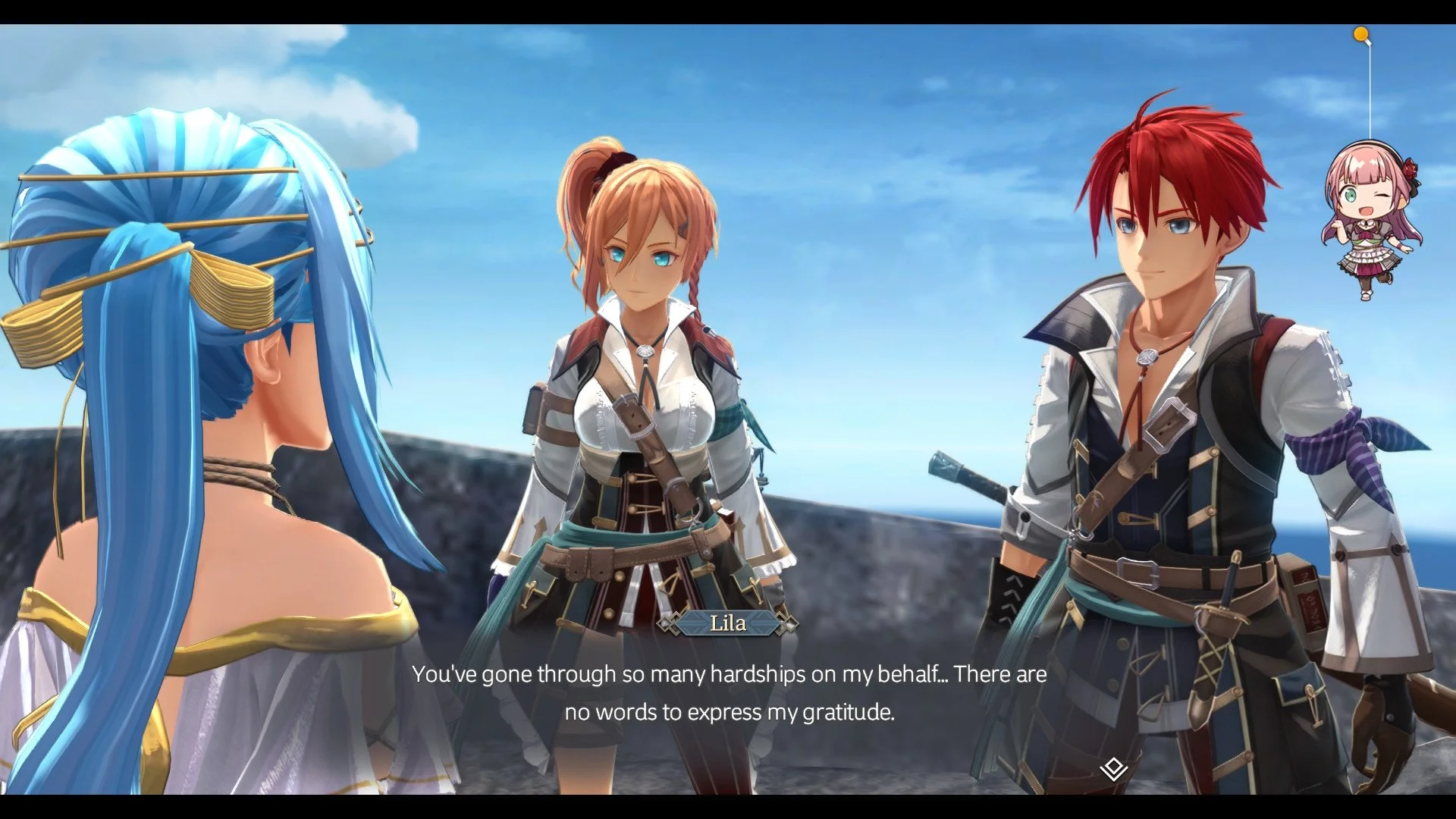 Included with Proud Nordics is all of the game’s DLC offerings. You get a ton of useful items for Adol and Karja, as well as your boat, but also all of the cosmetic dlc in each of the pair’s costumes. There are also little hanging chibi versions of each of the cast that you can pin on the screen and watch them bounce around as you take part in combat or swivel the camera around.