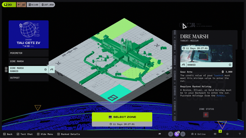 Ranked offers two matchmaking pools, Low Stakes and High Stakes, each with different gear ante and Holotag requirements. Holotags are central to progression: they set score targets, unlock overperformance capacity when looted from enemies, and can be purchased or found during matches. Additional mechanics like Tag Chips, loot caps, and crew-based scoring add depth to each run.
